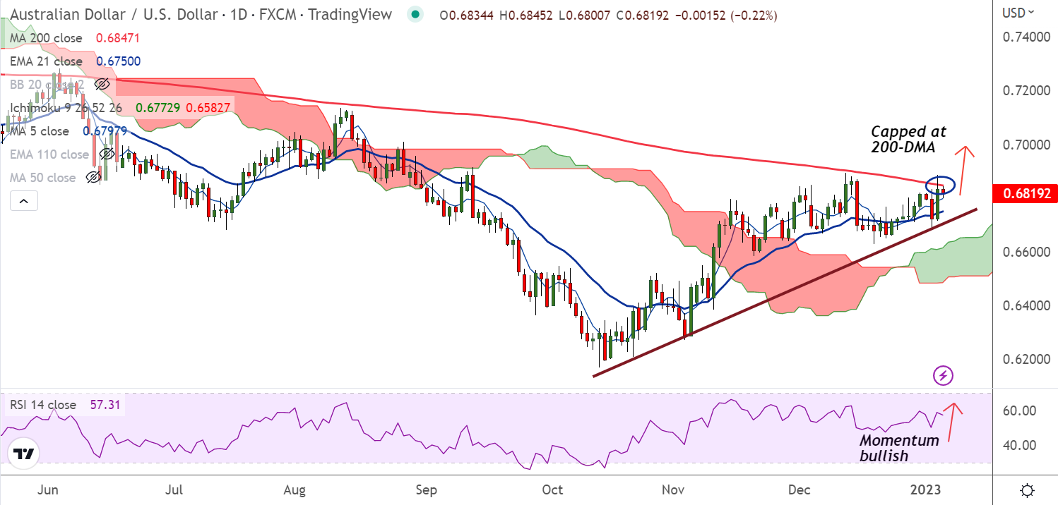 Support - 0.6800 (5-DMA), Resistance - 0.6847 (200-DMA)