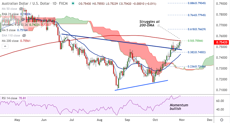 - AUD/USD struggles at major resistance at 200-DMA at 0.7556