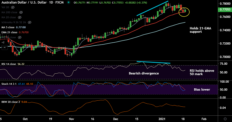 The pair has held support at 21-EMA and has snapped 2-day bearish streak as aussie finds bids after upbeat Australian housing data.