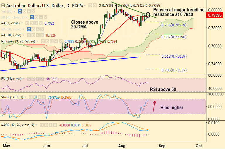 - AUD/USD has closed past 20-DMA resistance at 0.7925 on Monday's trade, bias higher.