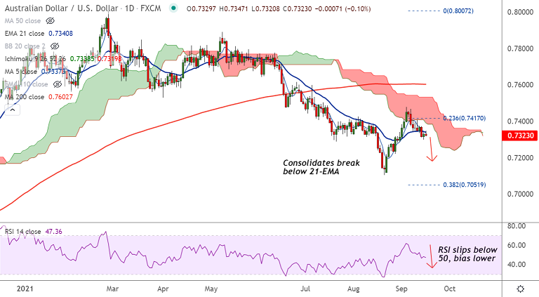 AUD/USD was trading 0.13% lower on the day at 0.7321 at around 06:20 GMT, bias bearish.