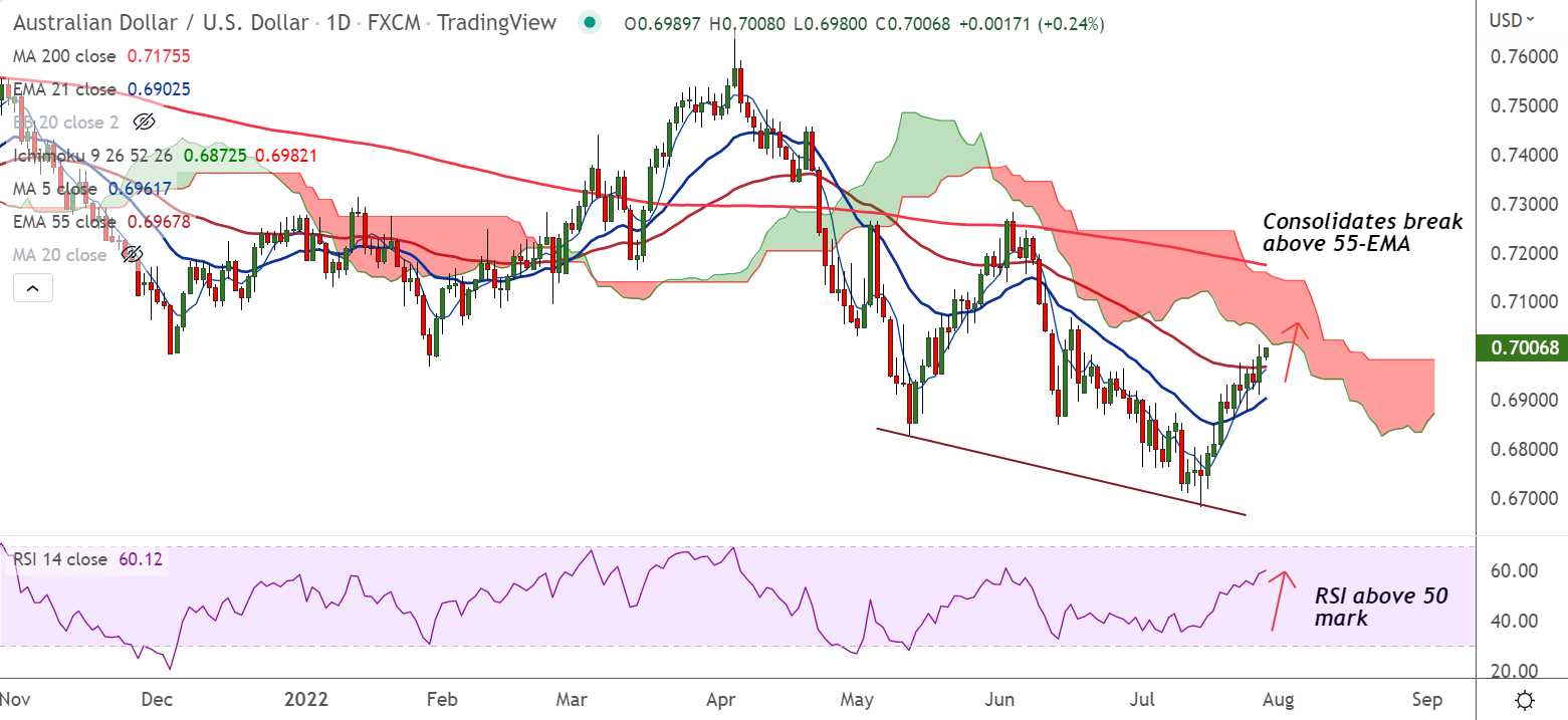 AUD/USD was trading 0.17% higher on the day at 0.7000 at around 06:10 GMT. The pair is extending gains after close above 55-EMA in the previous session.