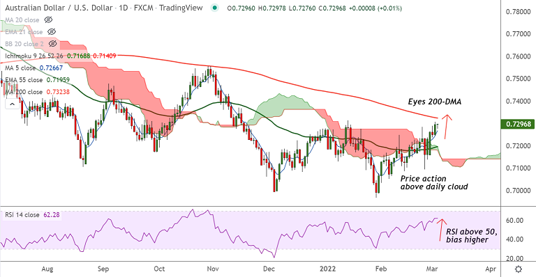 Summary: AUD/USD trades with a bullish bias. The pair is on track to test 200-DMA at 0.7323.