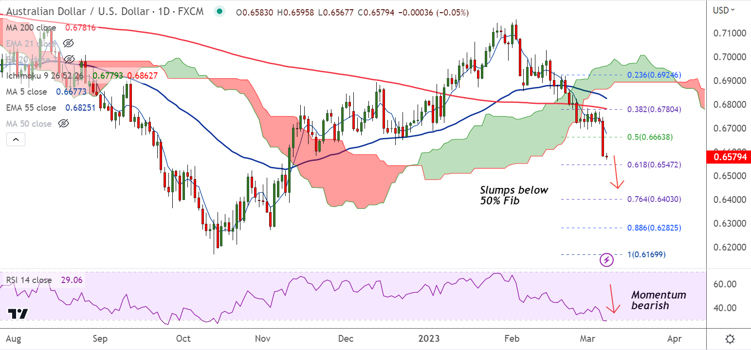 Technical Summary: AUD/USD has hit fresh 4-month lows at 0.6567 and is poised for further downside. Price action is well below cloud and major moving averages which are trending lower.