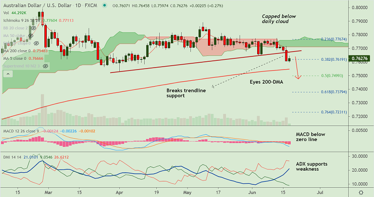 Price action has broken major trendline support at 0.7675 and has tested 38.2% Fib at 0.7619. Scope for test of 200-DMA at 0.7548.