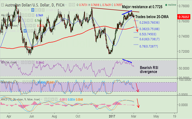 Resistance levels - 0.7665 (5-DMA), 0.7669 (20-DMA), 0.77, 0.7725 (Trendline), 0.7778 (Nov 8 high)
