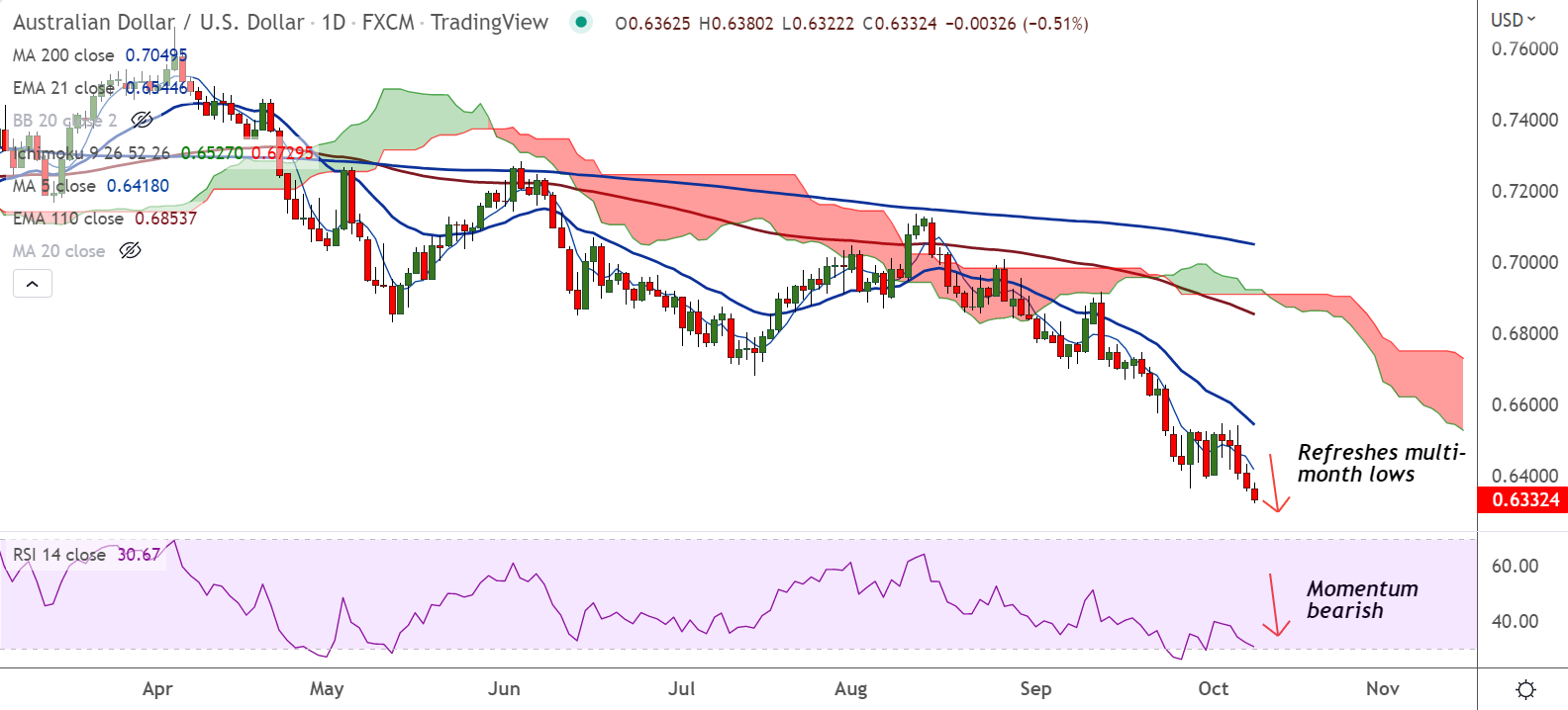 AUD/USD was trading 0.47% lower on the day at 0.6335 at around 05:00 GMT. The pair is extending weakness for the fifth straight session, outlook remains bearish.