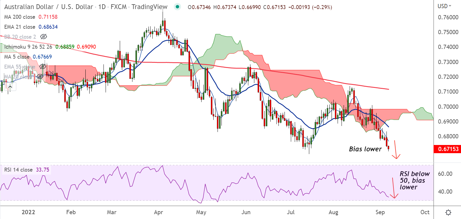 Summary: AUD/USD poised for further downside. Technical indicators support weakness in the pair. Scope for test of fresh yearly lows below 0.6681.