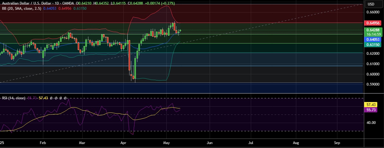 • Immediate resistance is located at 0.6452(22d April high), any close above will push the pair towards 0.6499(23.6%fib).