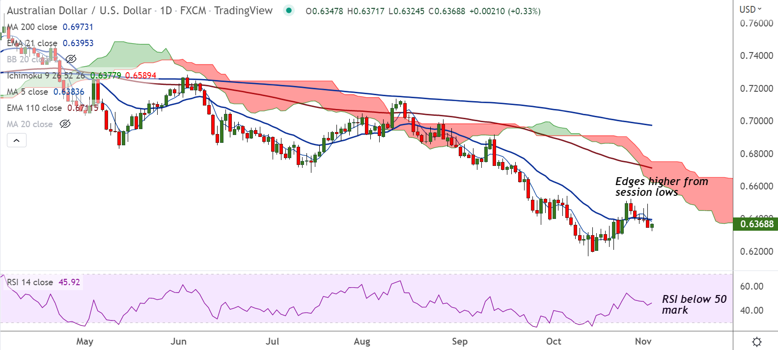 Summary: AUD/USD was trading with a bearish bias. Recovery attempts lack traction. Price action is holding 20-DMA support, break below will see more downside.