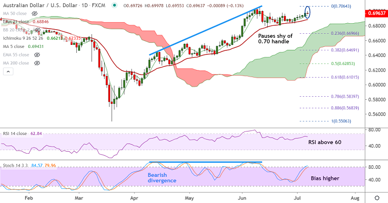 AUD/USD was trading 0.13% lower on the day at 0.6963 at around 04:00 GMT, bias remains bullish.