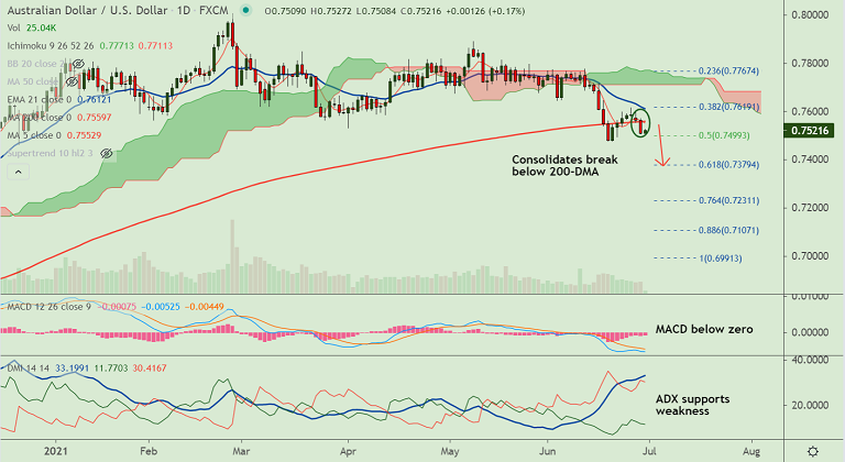 Technical bias for the pair is biased lower. The pair is consolidating break below 200-DMA, scope for further downside.