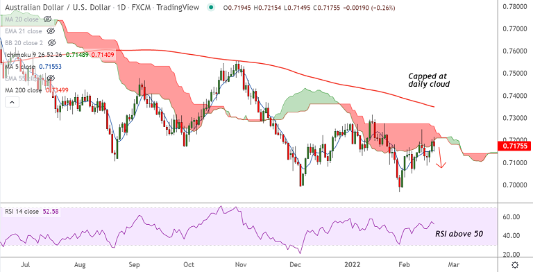 AUD/USD has trimmed some of the losses and has edged higher from session lows at 0.7149. Volatility to rule markets amid Russia-Ukraine tensions.