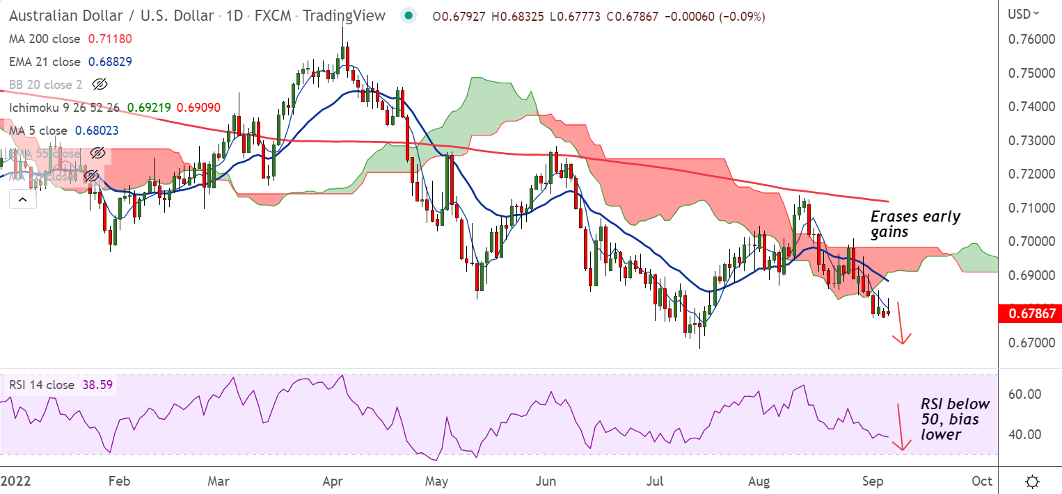 Technical indicators are supportive of further downside in the pair. Price action has failed to hold break above 5-DMA.