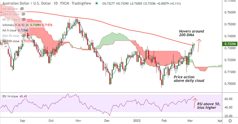 Technical indicators support gains in the pair. Weekly close above 200-DMA will fuel further gains.