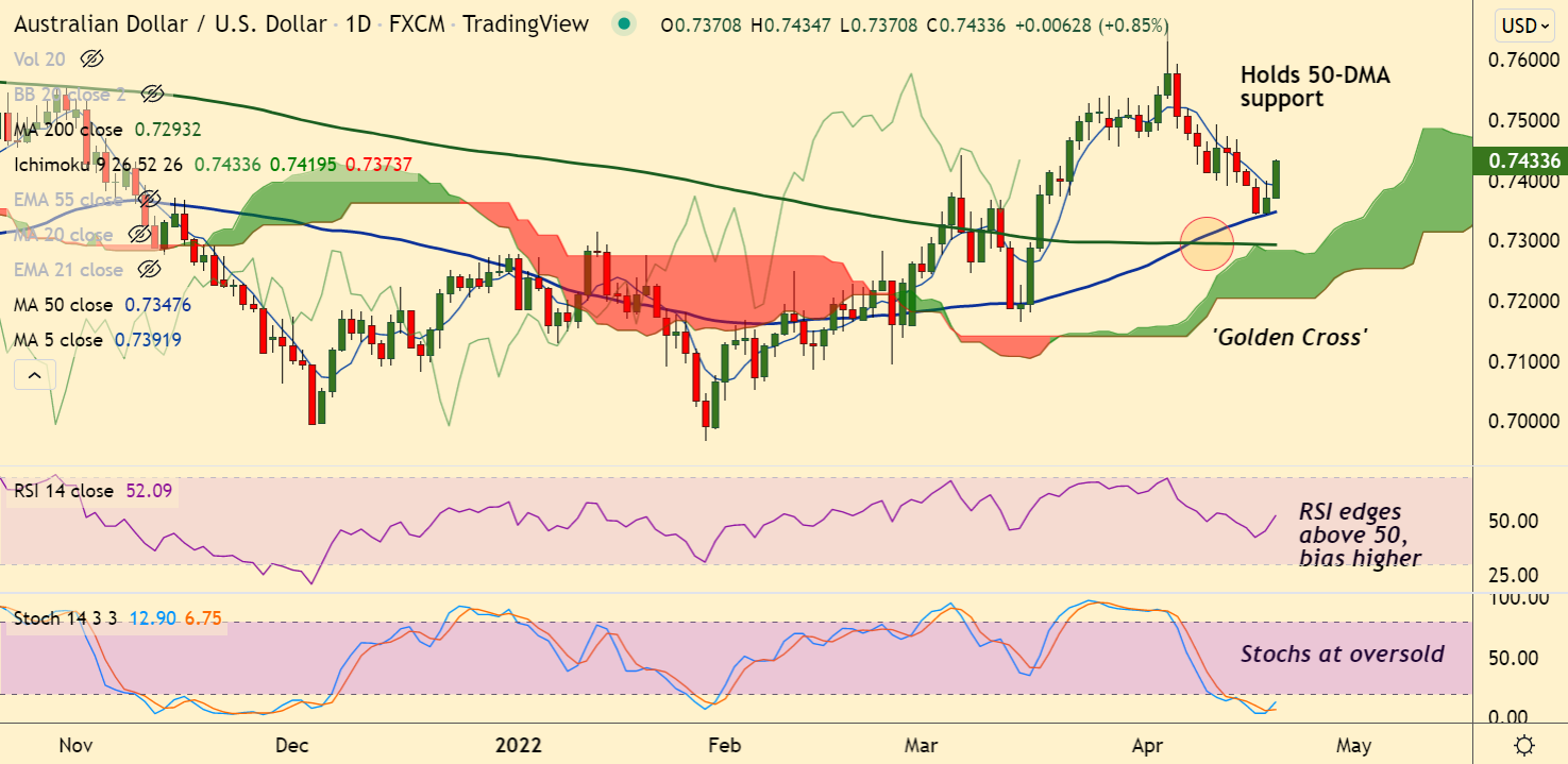 Summary: AUD/USD bias is turning bullish. Weakness only on break below 50-DMA. Scope for test of 0.75 level.
