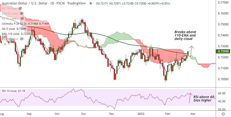 - AUD/USD breaks above 110-EMA and daily cloud resistance