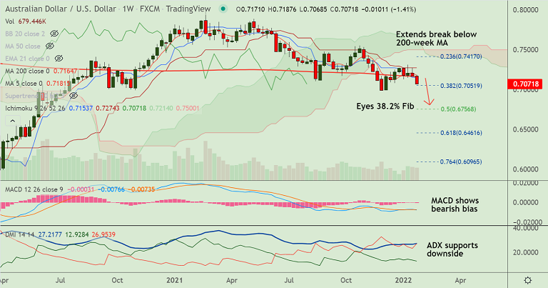 AUD/USD trades below 200-week MA and is on track to test 38.2% Fib at 0.7051. Break below to see more weakness.
