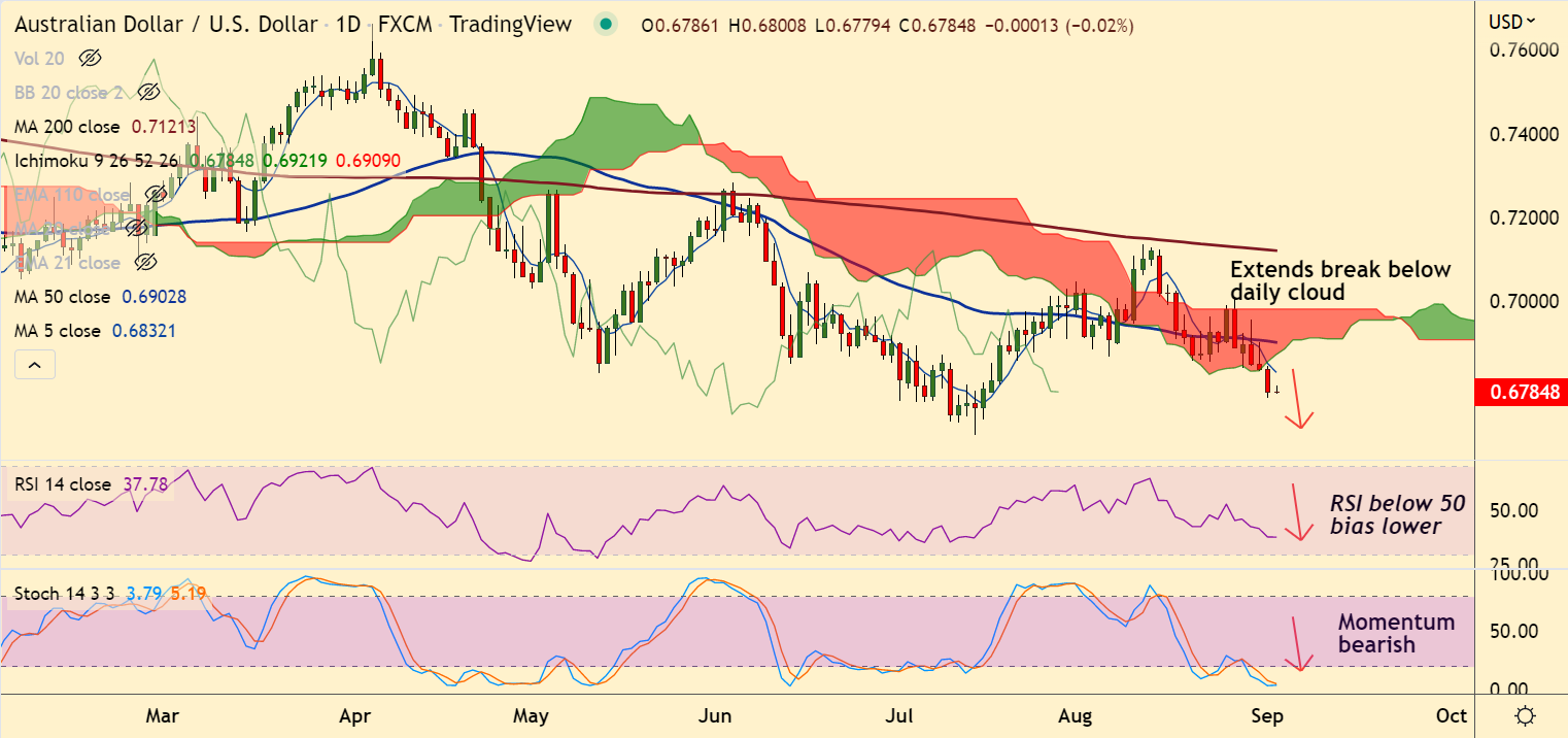 The pair is extending weakness below daily cloud, slips lower from session highs at 0.6800.