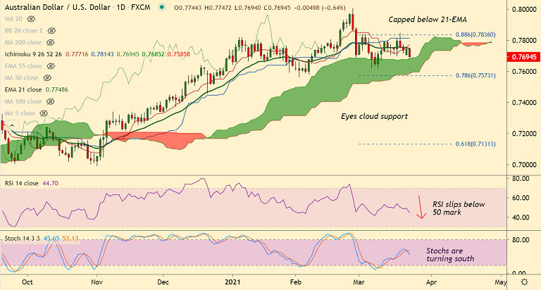 AUD/USD upside remains capped at 21-EMA. The pair finds strong support at daily cloud. Breach below will drag prices lower.