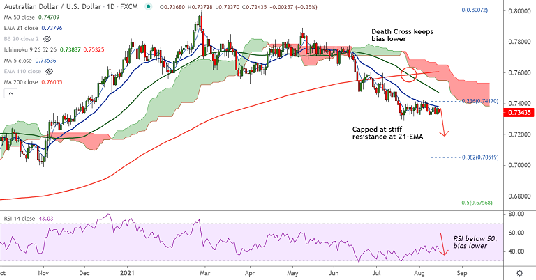 Technical bias for the pair remains bearish. Upside remains capped at stiff resistance at 21-EMA.