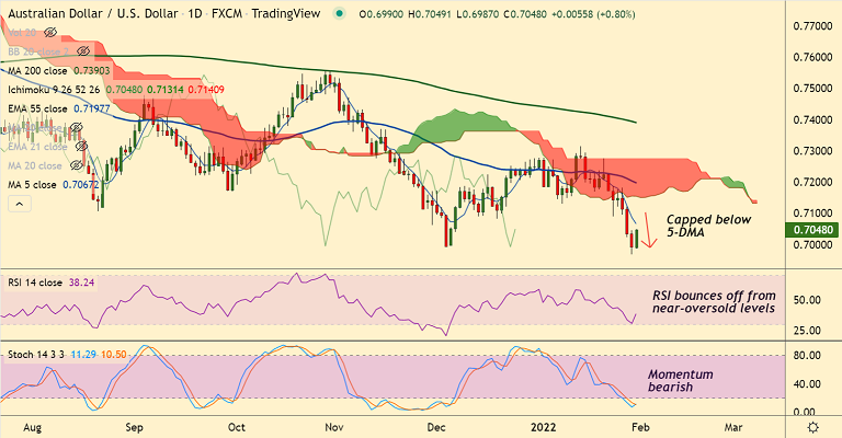 Summary: AUD/USD recovery lacks traction. Major trend remains bearish. Break above 5-DMA could see some upside. Breakout above daily cloud will change near-term dynamics.