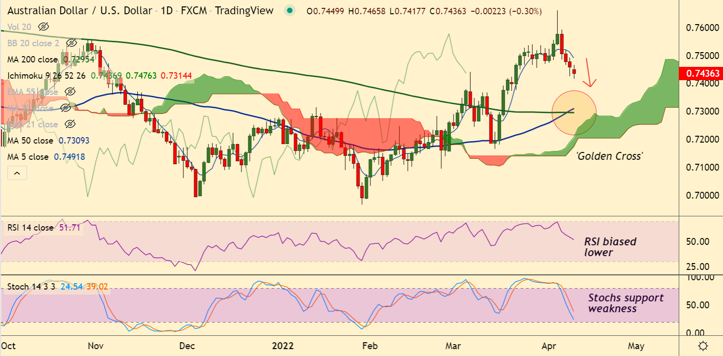 Major support levels are seen at 0.7347 (55-EMA), 0.7311 (110-EMA), 0.7295 (200-DMA). While major resistance levels align at 0.7445 (21-EMA), 0.7492 (5-DMA), 0.75.