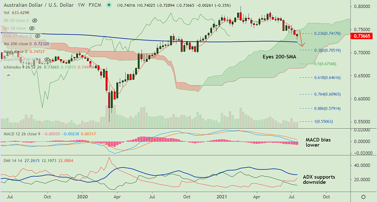 Support - 0.7232 (200-week MA), Resistance - 0.7406 (200H MA)