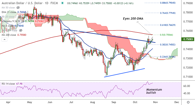 Summary: AUD/USD trades with a bullish bias. Scope for test of 200-DMA at 0.7558.