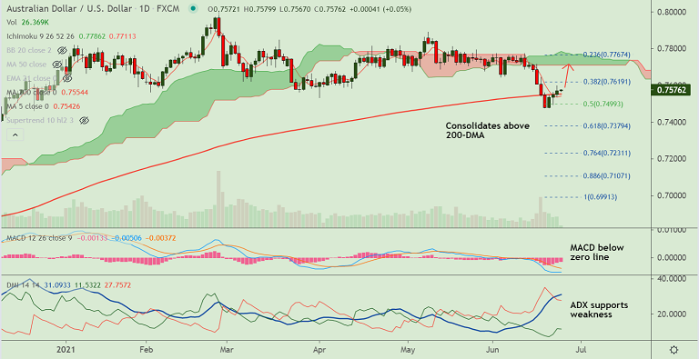 Summary: AUD/USD close above 200-DMA on Wednesday's trade has raised scope for further upside. Break above 21W EMA at 0.7650 will ensure bullish continuation.
