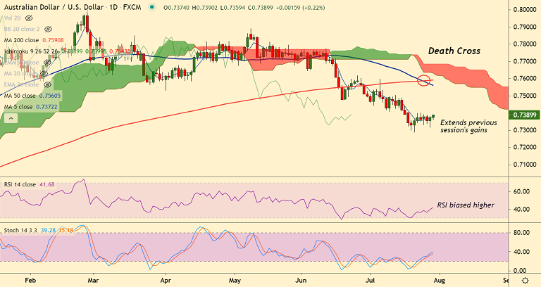 Support - 0.7372 (5-DMA), Resistance - 0.7425 (21-EMA)