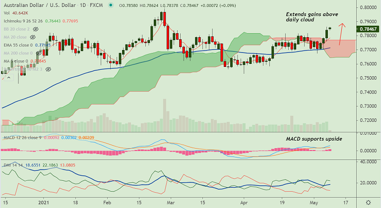 Technical indicators are bullishly aligned and support gains. Price action is above cloud and major moving averages.