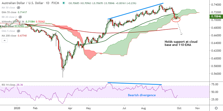 Immediate hurdle on the upside lies at 55-EMA at 0.7141. Retrace above could see upside continuation.