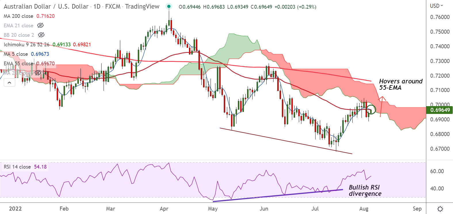 AUD/USD was trading 0.32% higher on the day at 0.6966 at around 05:55 GMT, bias is turning bullish.