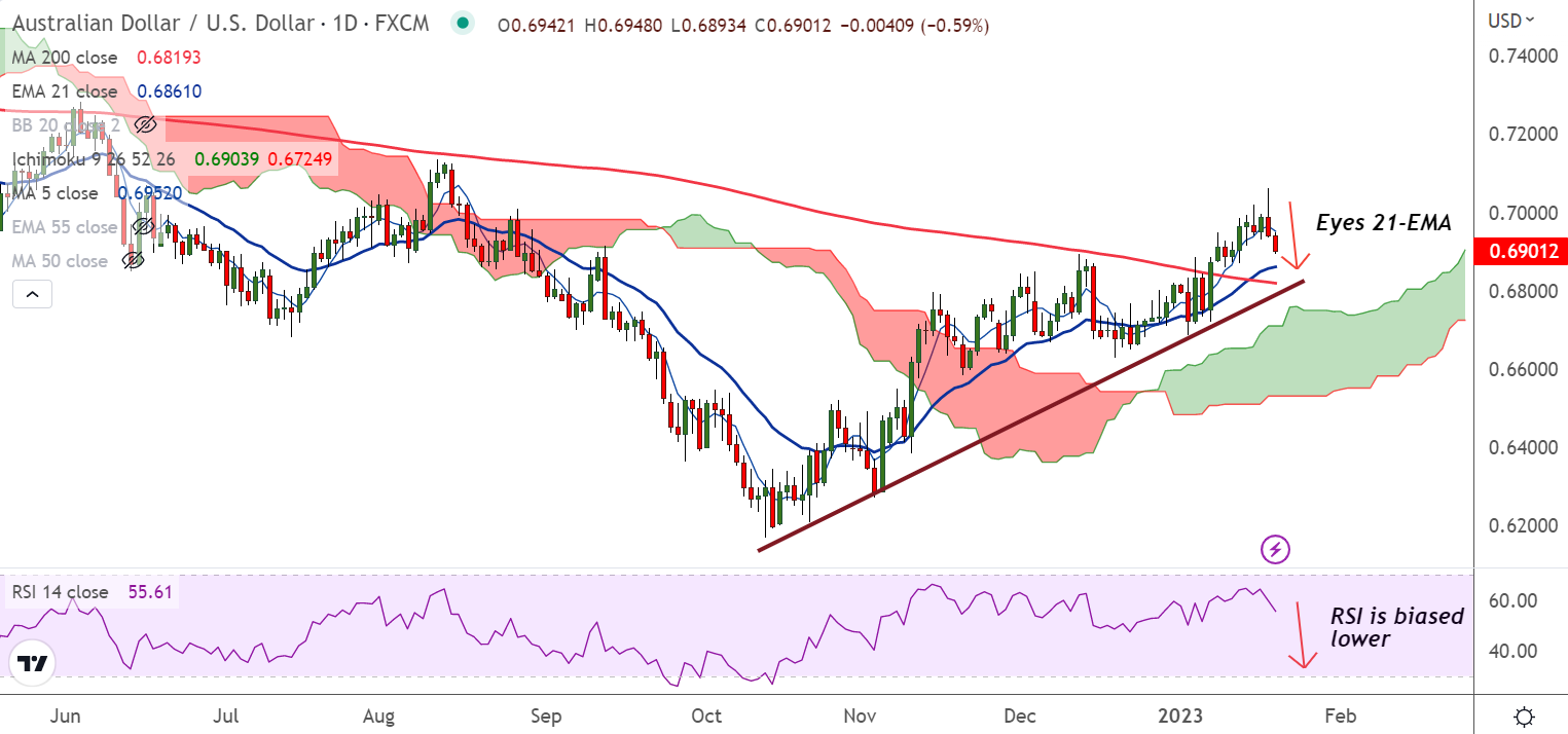 Summary: AUD/USD trades with a bearish bias on the intraday charts. Scope for test of 21-EMA at 0.6861.