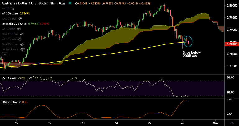 AUD/USD was trading 0.19% lower on the day at 0.7855 at around 04:10 GMT, edges slightly higher from session lows at 0.7823.