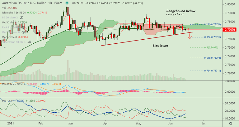 Scope for test of trendline support at 0.7670, breach below will drag the pair lower. On the flipside, breakout above cloud will negate any bearish bias.