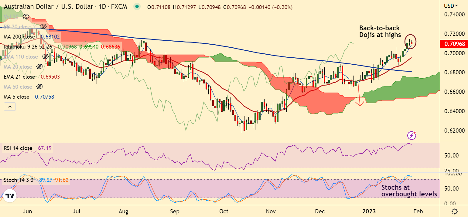 - Back-to-back Doji formation on the daily candles indicate signs of exhaustion
