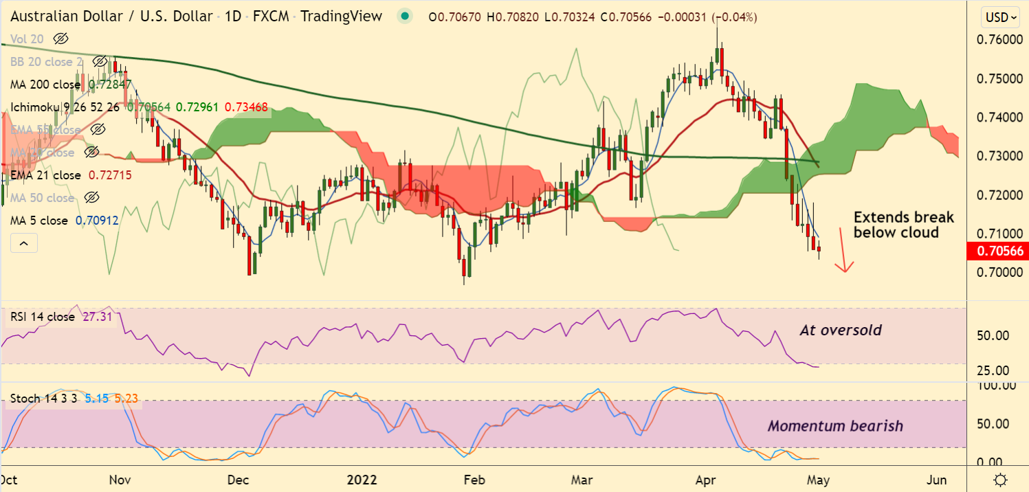 Summary: AUD/USD poised for more downside. Next support lies at 2022 low at 0.6967.