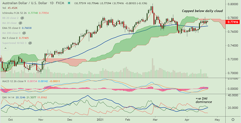 Technical indicators are mildly positive but do not provide a clear directional bias. The pair is extending sideways below daily cloud resistance.