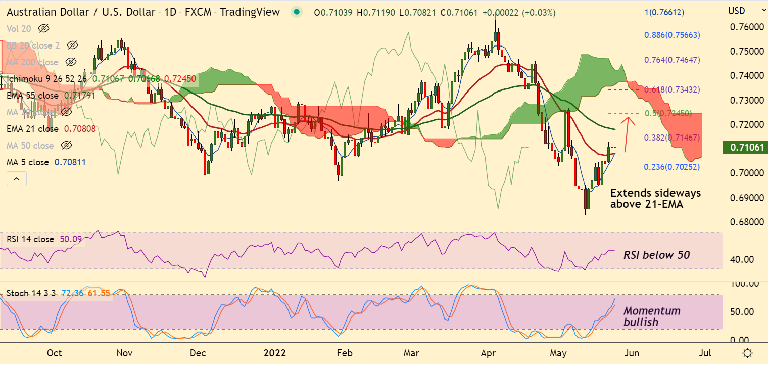 Summary: AUD/USD was trading with a bullish bias. Scope for test of 38.2% Fib at 0.7146. Bullish invalidation below 21-EMA.