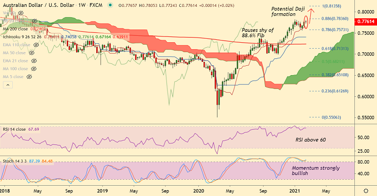 Technical indicators do show any major sign of reversal, but potential Doji formation on this week's candle, dents upside.