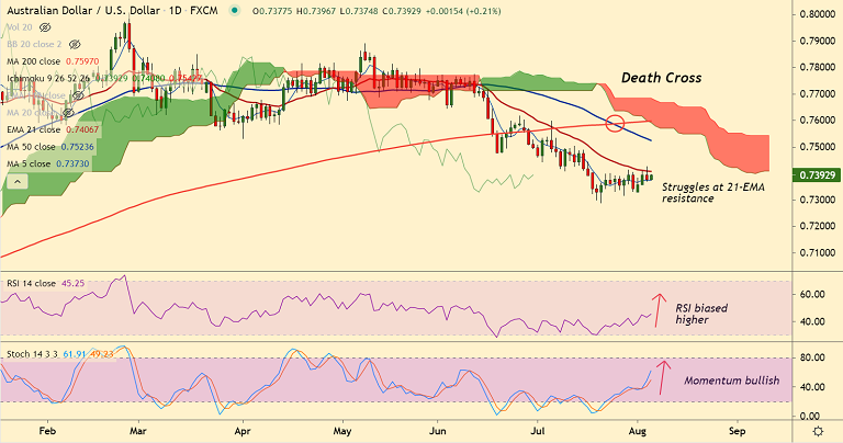 Major trend is the pair is bearish. Death Cross on the daily charts limits any upside in the pair. 21-EMA is immediate resistance at 0.7406, decisive break above will change near-term dynamics.