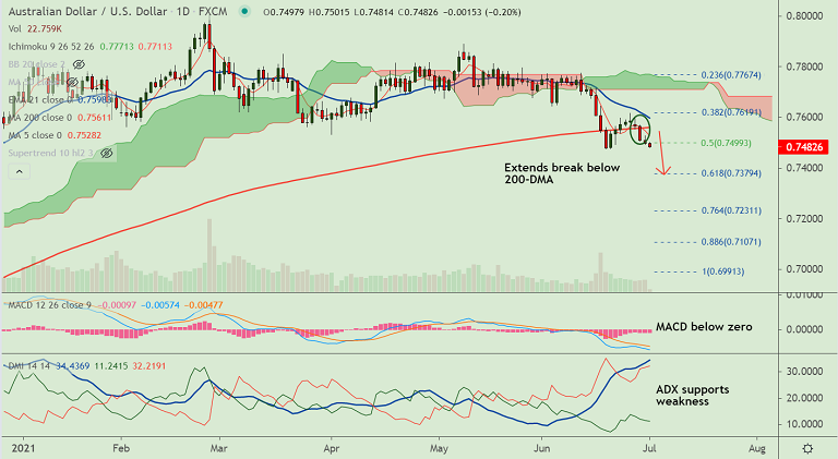 - AUD/USD is extending break below 200-DMA