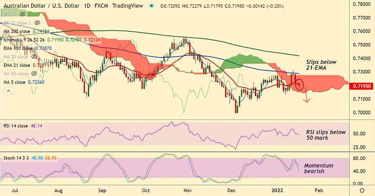 Technical bias is bearish. Price action has failed to hold break above daily cloud, the pair has slipped below 21-EMA.