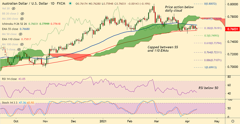 Resistance levels - 0.7628 (5-DMA), 0.7651 (21-EMA), 0.7667 (55-EMA)
