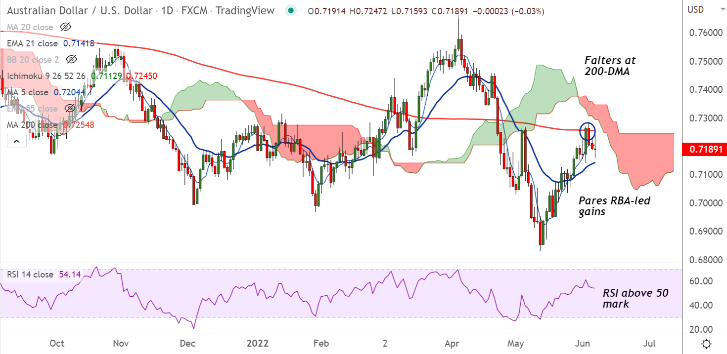 The major has erased hawkish RBA-led gains and has retraced below 0.72 handle, down from session highs at 0.7247.