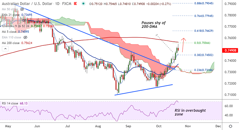 Summary: AUD/USD trades with a strong bullish momentum. Price action has approached crucial resistance at 200-DMA at 0.7562. Decisive break above required for upside continuation.