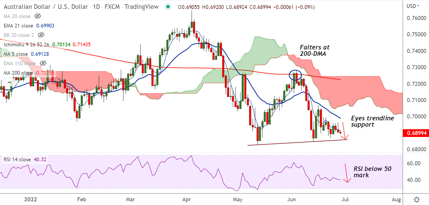 Summary: AUD/USD was trading with a bearish bias. Scope for dip till trendline support at 0.6855.