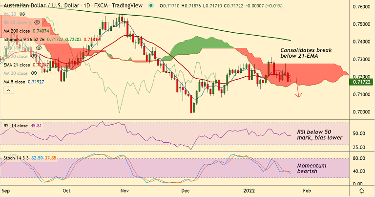 - AUD/USD is set to extend break below 21-EMA and trendline support